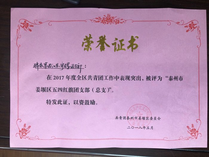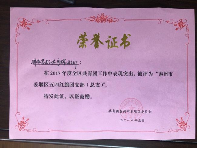 2017年以來(lái),江蘇宇輝團(tuán)委在錦宸集團(tuán)江蘇宇輝黨支部的正確領(lǐng)導(dǎo)下,深入學(xué)習(xí)黨的十九大精神和習(xí)近平新時(shí)代中國(guó)特色社會(huì)主義思想,按照黨支部和上級(jí)團(tuán)組織工作部署和要求,以思想建設(shè)為先導(dǎo),以組織建設(shè)為基礎(chǔ),以文化培育為載體,以品德修養(yǎng)為目標(biāo),在加強(qiáng)團(tuán)的自身建設(shè)、拓展團(tuán)的工作領(lǐng)域、創(chuàng)新團(tuán)的工作機(jī)制等方面取得了新成效。榮獲“2017年度泰州市姜堰區(qū)五四紅旗團(tuán)支部”殊榮。