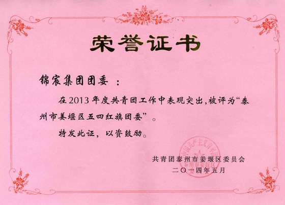 近日,集團(tuán)公司團(tuán)委榮獲2013年度姜堰區(qū)“五四紅旗團(tuán)委”稱號(hào)。據(jù)悉,全區(qū)共有直屬團(tuán)委50多個(gè),非直屬團(tuán)委若干,此次評(píng)選僅有6個(gè)基層團(tuán)委獲此殊榮!拔逅募t旗團(tuán)委”是基層團(tuán)組織的先進(jìn)典型,同時(shí)也是團(tuán)區(qū)委授予基層團(tuán)組織的最高榮譽(yù),這是對(duì)我公司共青團(tuán)工作的肯定,更是對(duì)我公司共青團(tuán)工作的極大鼓勵(lì)。