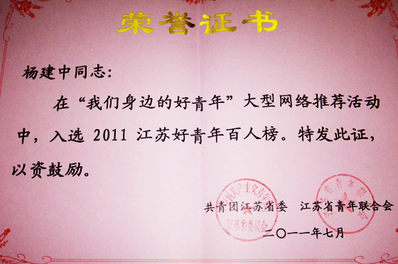 楊建中同志在江蘇省“我們身邊的好青年”大型網(wǎng)絡(luò)推薦活動(dòng)中,入選