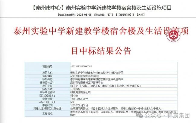從泰州市公共資源交易中心獲悉,錦宸集團(tuán)中標(biāo)泰州實(shí)驗(yàn)中學(xué)新建教學(xué)樓宿舍樓及生活設(shè)施項(xiàng)目,這是繼張甸鎮(zhèn)村民集中居住區(qū)建設(shè)項(xiàng)目一期工程(北沿江配套)、蔣垛鎮(zhèn)果蔬深加工廠房建設(shè)項(xiàng)目(二期)后,集團(tuán)公司在一個(gè)月內(nèi)的第三次中標(biāo),中標(biāo)總額達(dá)2.56億元,為沖刺全年再發(fā)力打下堅(jiān)實(shí)基礎(chǔ)。