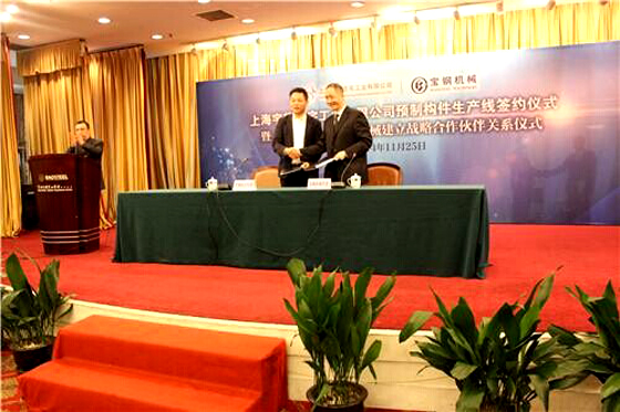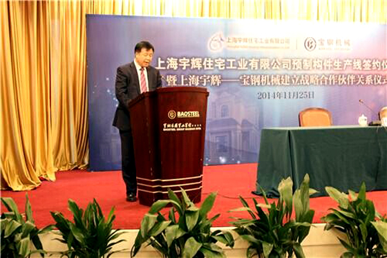 11月25日上午,上海宇輝住宅工業(yè)有限公司預制構(gòu)件生產(chǎn)線簽約儀式暨上海宇輝--上海寶鋼工業(yè)技術(shù)有限公司機械分公司戰(zhàn)略協(xié)議簽約儀式,在上海寶鋼集團寶山賓館友誼會堂召開。寶鋼工程集團代表,上海多家建筑單位代表,本地多家知名民營企業(yè)代表,以及新聞媒體代表等參加會議,集團公司董事長李煥軍出席簽約儀式并講話。