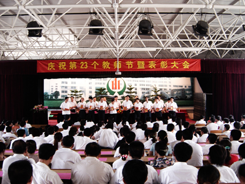 秋風(fēng)送爽,丹桂飄香。2007年9月10日,在第23個(gè)教師節(jié)到來之際,由中國錦宸集團(tuán)投資的泰州市民興實(shí)驗(yàn)中學(xué)隆重舉行慶祝教師節(jié)暨表彰大會(huì)。會(huì)上表彰了在上一學(xué)年學(xué)校教育、教學(xué)、教科研、管理、后勤服務(wù)等各項(xiàng)工作中涌現(xiàn)出來的16個(gè)先進(jìn)集體和119名先進(jìn)個(gè)人。學(xué)校董事長李煥軍、董事會(huì)常駐代表李煥亮、校長王加珍、副校長徐敬東、季忠良、王鵬、曹福春、葛恒榮、葛士才、馬國驥等領(lǐng)導(dǎo)出席大會(huì)并為獲得表彰的集體和個(gè)人頒獎(jiǎng)。 表彰大會(huì)由徐敬東副校長主持。在舉行了簡短的開場儀式后,王加珍校長代表校長室作報(bào)告。王校長在報(bào)告中對上一年全校的工作作了回顧,列舉了一學(xué)年來在教育、教學(xué)、行政管理、后勤服務(wù)等方面取得的成績,特別是2007年高考、中考繼續(xù)取得了輝煌的成績,圓滿完成了今年的招生計(jì)劃。王校長在報(bào)告中還對新學(xué)期學(xué)校主要工作進(jìn)行了布置。接著兩名先進(jìn)教師代表上臺(tái)作典型發(fā)言。 隨后季忠良副校長代表校長室宣讀了學(xué)校的表彰決定,經(jīng)過民主評(píng)議、層層推選,校長辦公會(huì)逐一審定產(chǎn)生的16個(gè)先進(jìn)集體代表和119名先進(jìn)個(gè)人在歡快的樂曲聲中分批到主席臺(tái)領(lǐng)獎(jiǎng)。這些先進(jìn)集體和先進(jìn)個(gè)人是從上一學(xué)年學(xué)校各戰(zhàn)線上評(píng)選出來的代表,他們?yōu)閷W(xué)校的發(fā)展作出了很大的貢獻(xiàn)。 頒獎(jiǎng)典禮結(jié)束后,李煥軍董事長作重要講話。他首先代表學(xué)校董事會(huì)、監(jiān)事會(huì)向全校教師致以崇高的敬意和節(jié)日的問候,向全校員工和同學(xué)們表示親切的慰問,向受表彰的同志表示祝賀。他指出,國家的未來發(fā)展,中華民族的偉大復(fù)興,歸根結(jié)底靠人才,人才培養(yǎng)的基礎(chǔ)在教育。教育是提高人民思想道德素質(zhì)和科學(xué)文化素質(zhì)的基本途徑。在新的時(shí)代條件下,黨和政府全面實(shí)施科教興國戰(zhàn)略和人才強(qiáng)國戰(zhàn)略,把教育擺在優(yōu)先發(fā)展的戰(zhàn)略地位,大力倡導(dǎo)尊師重教,大力發(fā)展教育事業(yè),大力提高全民族素質(zhì),一個(gè)“發(fā)展需要教育,國家重視教育,群眾支持教育,政策扶持教育”的局面正在逐步形成。 他列舉了學(xué)校在上一學(xué)年度高考、中考、招生及教育教學(xué)、后勤服務(wù)等方面取得的主要成績,并指出正是由于全體民興人的敬業(yè)精神和堅(jiān)忍不拔的拼搏毅力,才得以有今天的輝煌,這個(gè)輝煌歸功于全體教職工,他代表董事會(huì)、監(jiān)事會(huì)對全校廣大教職工付出的辛勤勞動(dòng)表示感謝。 李煥軍提出了學(xué)校新學(xué)期和今后一段時(shí)間的發(fā)展目標(biāo):2008年高三要在高考模式發(fā)生重大改革的情況下爭取新的勝利、初三要在今年取得優(yōu)異成績的基礎(chǔ)上創(chuàng)造更大的輝煌,要為早日創(chuàng)建成省四星級(jí)高中、省文明單位夯實(shí)基礎(chǔ)。他指出:時(shí)代在變革,“傳道、授業(yè)、解惑”已不再是教師內(nèi)涵的全部。在新的歷史時(shí)期,教師應(yīng)該有崇高的理想追求,有先進(jìn)的教育理念,有自覺的職業(yè)規(guī)范;教師不僅是知識(shí)的傳遞者,而且是道德的引導(dǎo)者,思想的啟迪者,心靈世界的開拓者,情感信念的塑造者!扒Ы倘f教教人求真,千學(xué)萬學(xué)學(xué)做真人”應(yīng)該成為我們每一位教師的座右銘。“辦人民滿意的教育,當(dāng)人民滿意的教師”始終是我們對社會(huì)的鄭重承諾。我們要信守諾言,堅(jiān)守崗位,不負(fù)時(shí)代的重托,不負(fù)人民的期望,為教育事業(yè)作出新的貢獻(xiàn)。 他對全校教師提出了幾點(diǎn)希望:希望老師們以身立教,為人師表;希望老師們刻苦鉆研,嚴(yán)謹(jǐn)篤學(xué);希望老師們愛崗敬業(yè),善待學(xué)生;希望老師們團(tuán)結(jié)合作,勇于競爭。李煥軍董事長熱情洋溢的講話博得場內(nèi)陣陣掌聲。